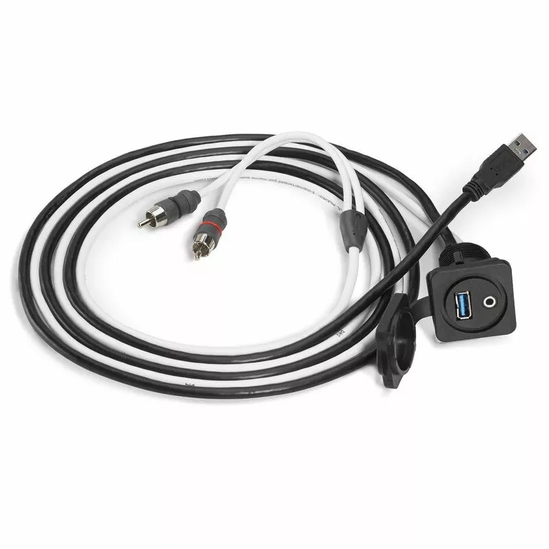 This panel-mount combination jack facilitates the creation of a permanent connection point for a wide variety of portable audio sources, including USB-compatible digital music players, thumb drives and smartphones. The jack accepts a 3.5 mm stereo plug for analog audio signals, providing output via a pair of male RCA plugs. A separate 9-wire USB Type A jack is provided for connection and charging of digital devices, outputting via a male USB Type A connector (USB 2.0 and USB 3.0-compatible). An appropriate USB cable for your device is required to make the input connection.