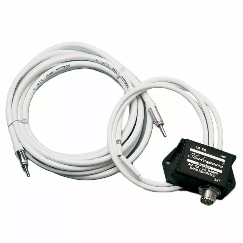The Style 4357-S is a solid-state, passive device that filters AM/FM signals from any VHF antenna, directing them to an AM/FM radio. The Band Separator lets you use both signals at the same time, without purchasing a separate AM/FM antenna. The device’s pick off point is not in line with the power going to the VHF radio and will not cause harm to the AM/FM radio when transmitting a VHF signal.